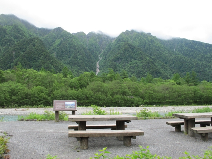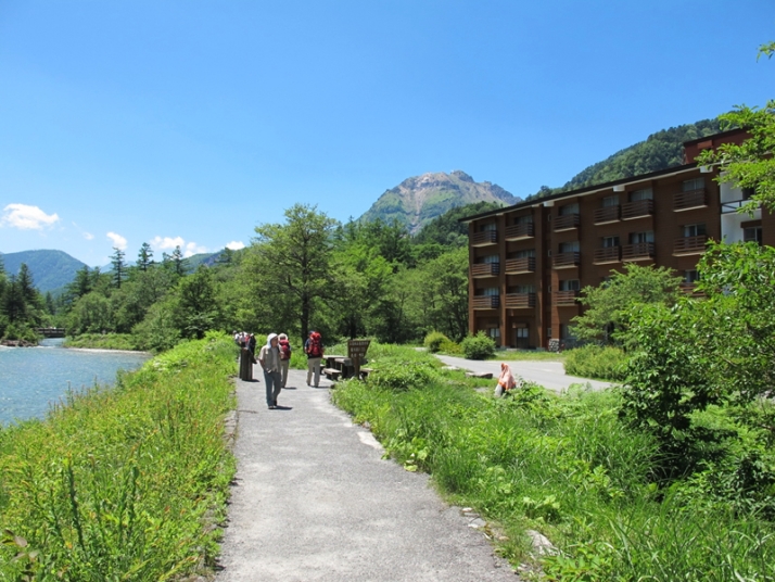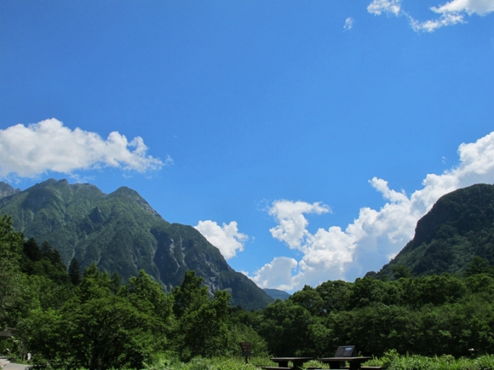 入道雲が山影から立ち上り午後には夕立がありそうです。散策の方もハンカチで汗を拭いています。ただ、日陰では湿度が低いせいかとても爽やかです。梓川沿いではニッコウキスゲやマツムシソウが出迎えてくれます。